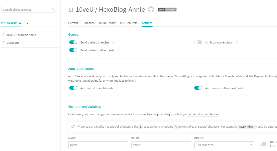 将上面获取到的token添加到 Environment Variables 部分,值为该 token ,而名称即为上面设置的 Travis_Token (请更改为个人所设置名称)。不勾选后面的 Display value in build log . 否则会在日志文件中暴露你的 token 信息,而日志文件是公开可见的。