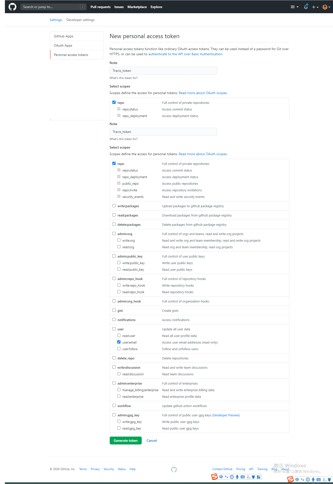 在Github的setting页面,左侧面板选择Developer settings然后Personal access tokens, 右上角点击Generate new token。生成token时候需要确定访问scope,这里我们选择我们的repo即可。