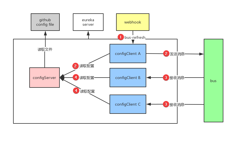 Webhook监听被触发,给ConfigClient A发送bus-refresh请求刷新配置ConfigClient A读取ConfigServer中的配置,并且发送消息给BusBus接收消息后广播通知其他Config Client- 其他