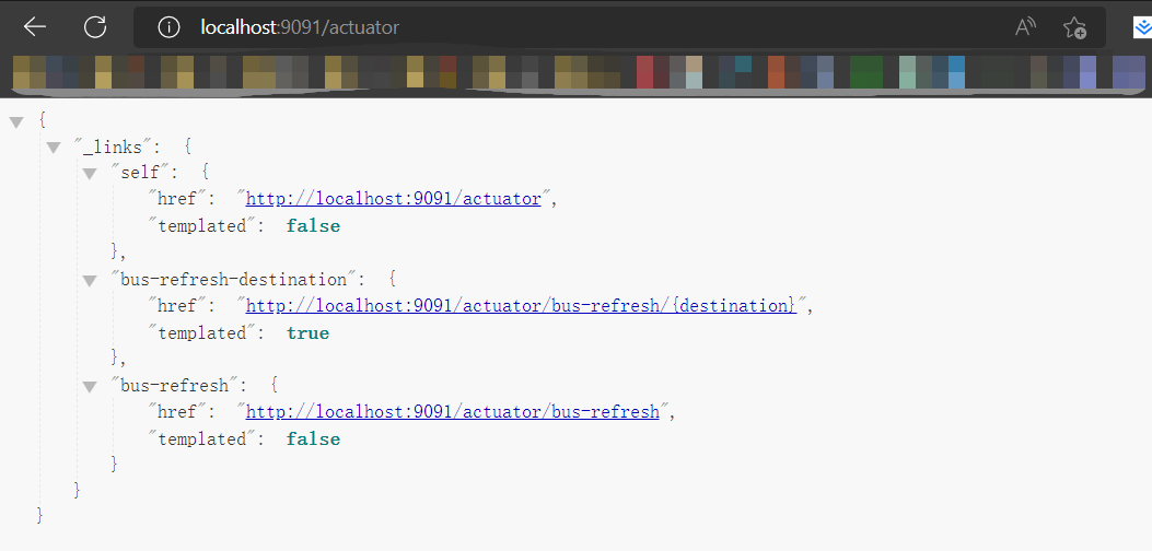 访问:http://localhost:9091/actuator 可以看到已经开启了 bus-refresh 自动刷新端点。