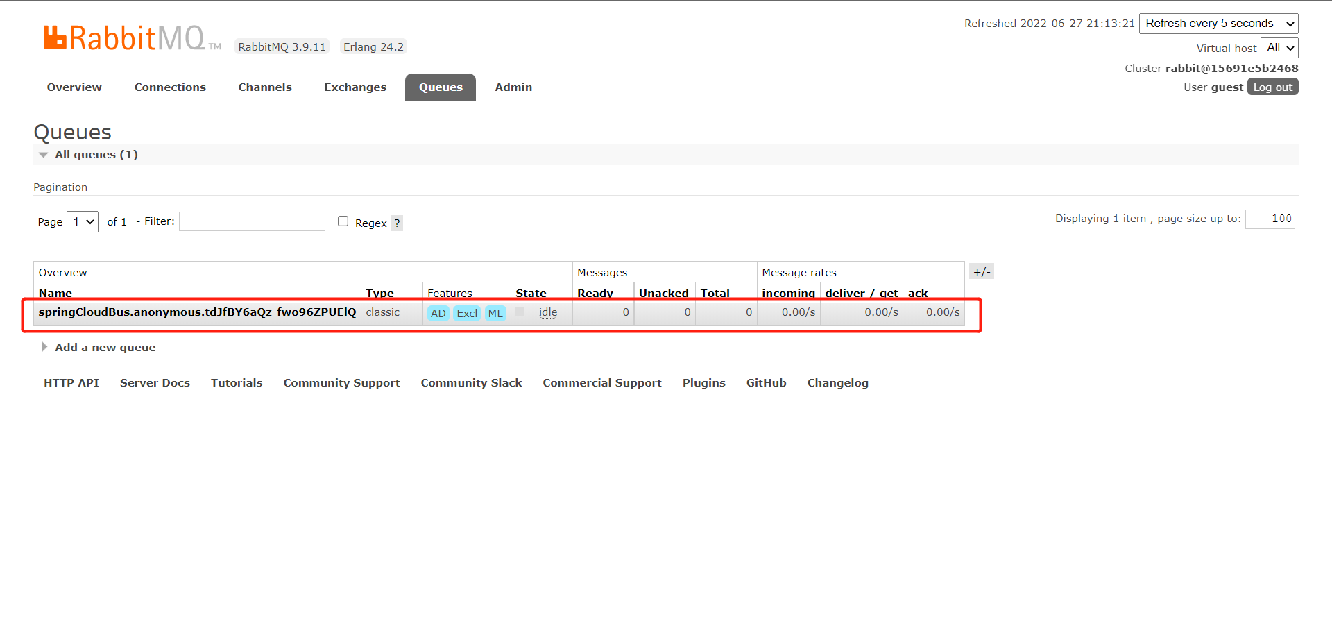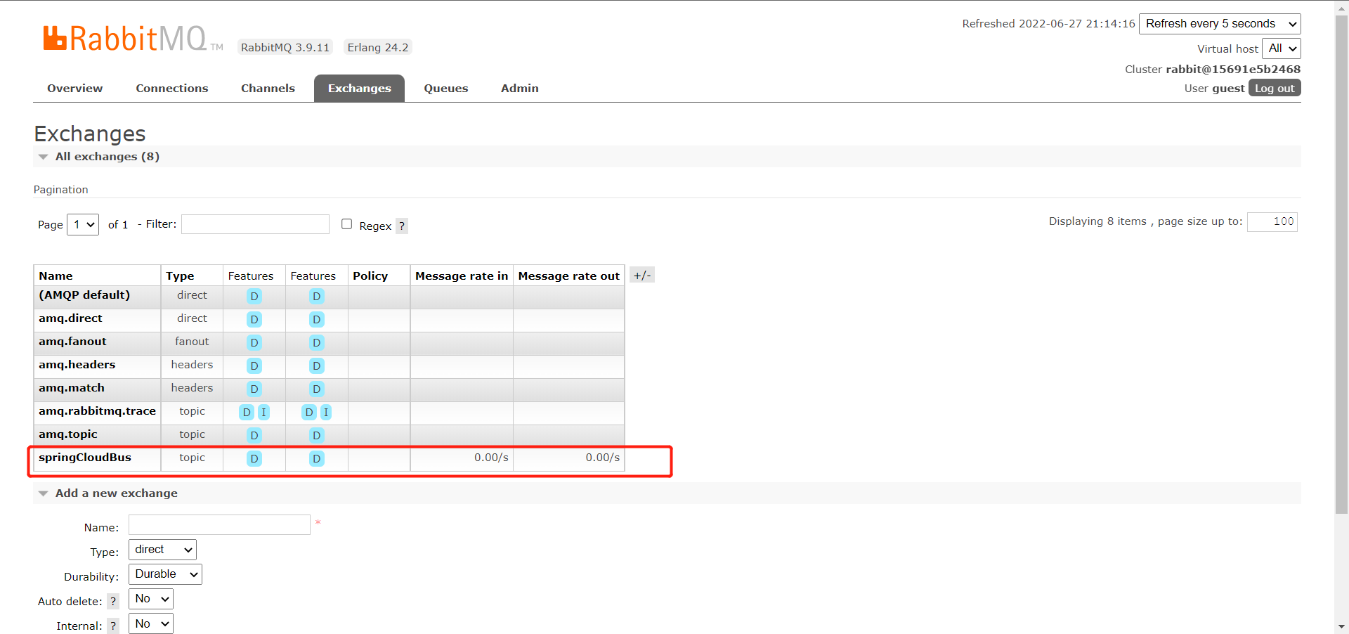 再来观察一下消息队列的 UI 界面,发现多了一个 springCloudBus 的交换机。