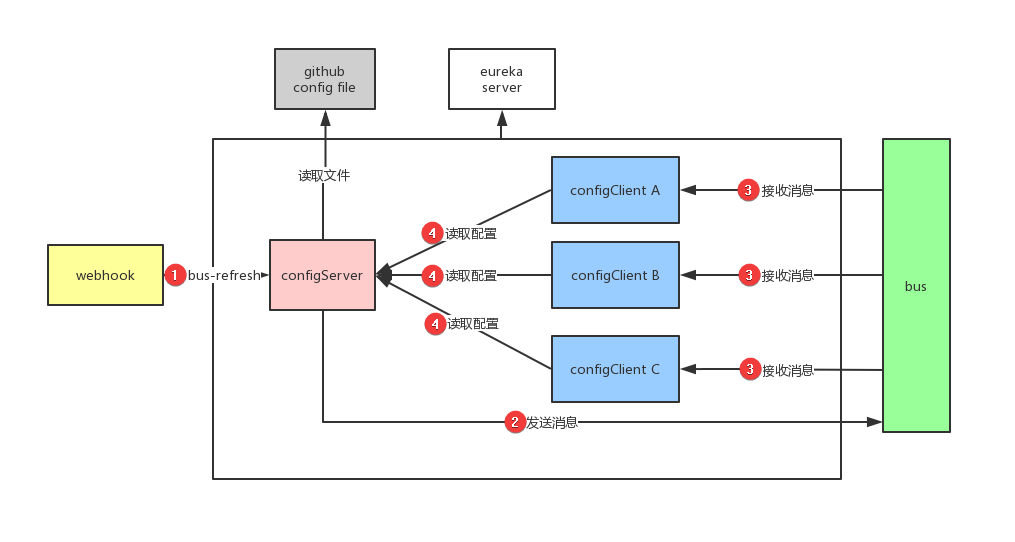 Webhook监听被触发,给Config Server发送bus-refresh请求刷新配置Config Server发送消息给BusBus接收消息后广播通知所有Config Client- 各