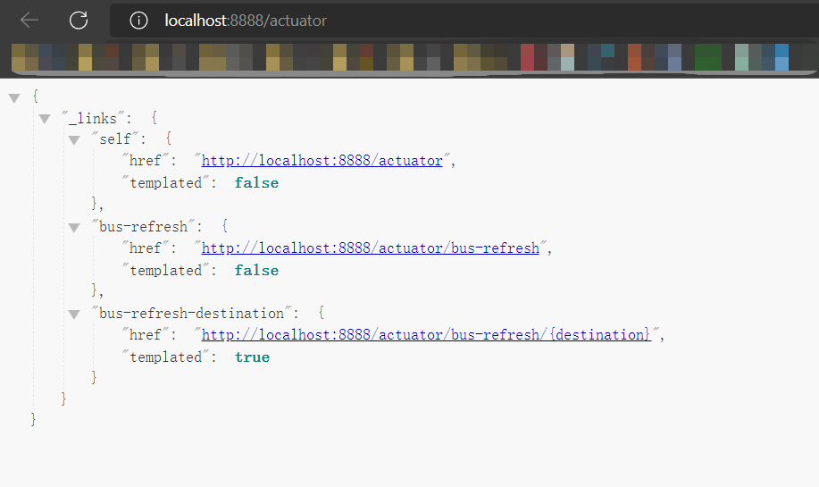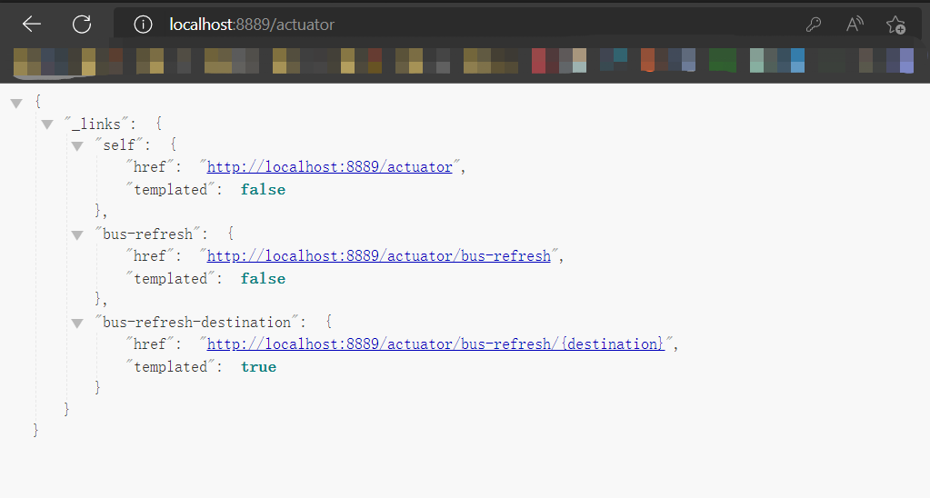 访问:http://localhost:8888/actuator 和http://localhost:8889/actuator 可以看到已经开启了 bus-refresh 自动刷新端点。
