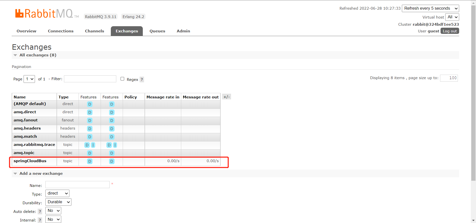 RabbitMQ的控制台多了一个springCloudBus的交换机。